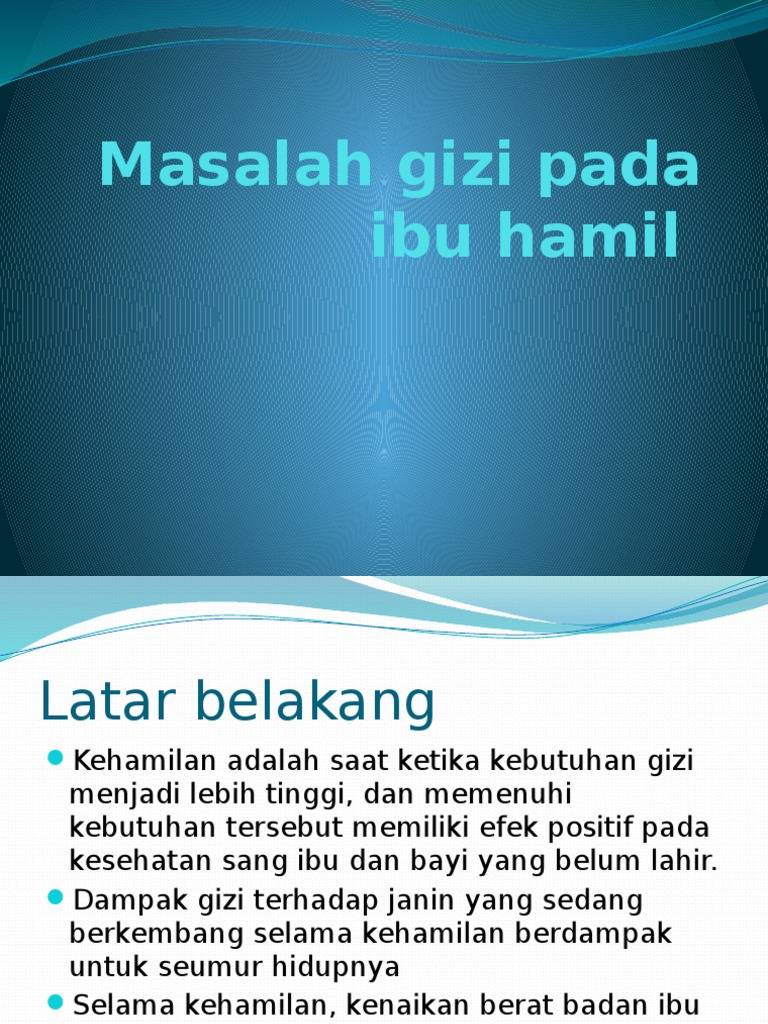 Gizi ibu hamil merupakan nutrisi yang diperlukan dalam jumlah yang banyak untuk pemenuhan gizi ibu sendiri dan perkembangan janin yang dikandungnya. Bila mengalami kekurangan gizi selama hamil akan menimbulkan masalah. 11 Latar Belakang.